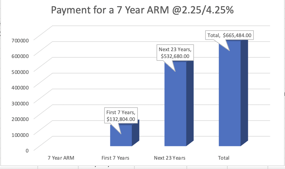 This chart assumes a $400,000 loan, the fixed rate is at 3.25%, while for a 7 year ARM the start rate is 2.5%. In the first 7 years, you would have saved $13,440 in monthly payments on an ARM loan. Assume, the rate on the ARM adjusts to 4.5% after 7 years and stays at the same rate (i.e. 4.5%) for the next 23 years. In that case, if you chose the loan for 30 years Fixed-rate, you would have saved $38,724 in mortgage payments.
